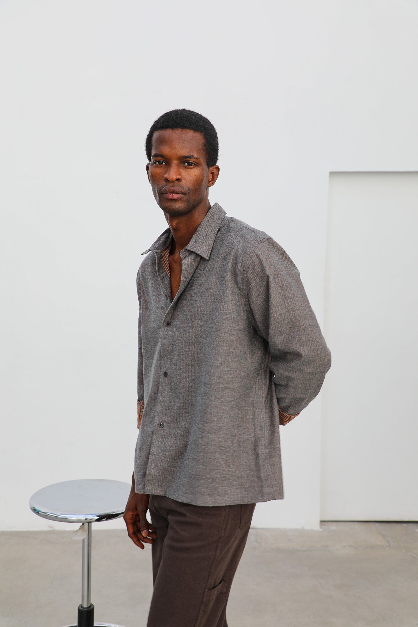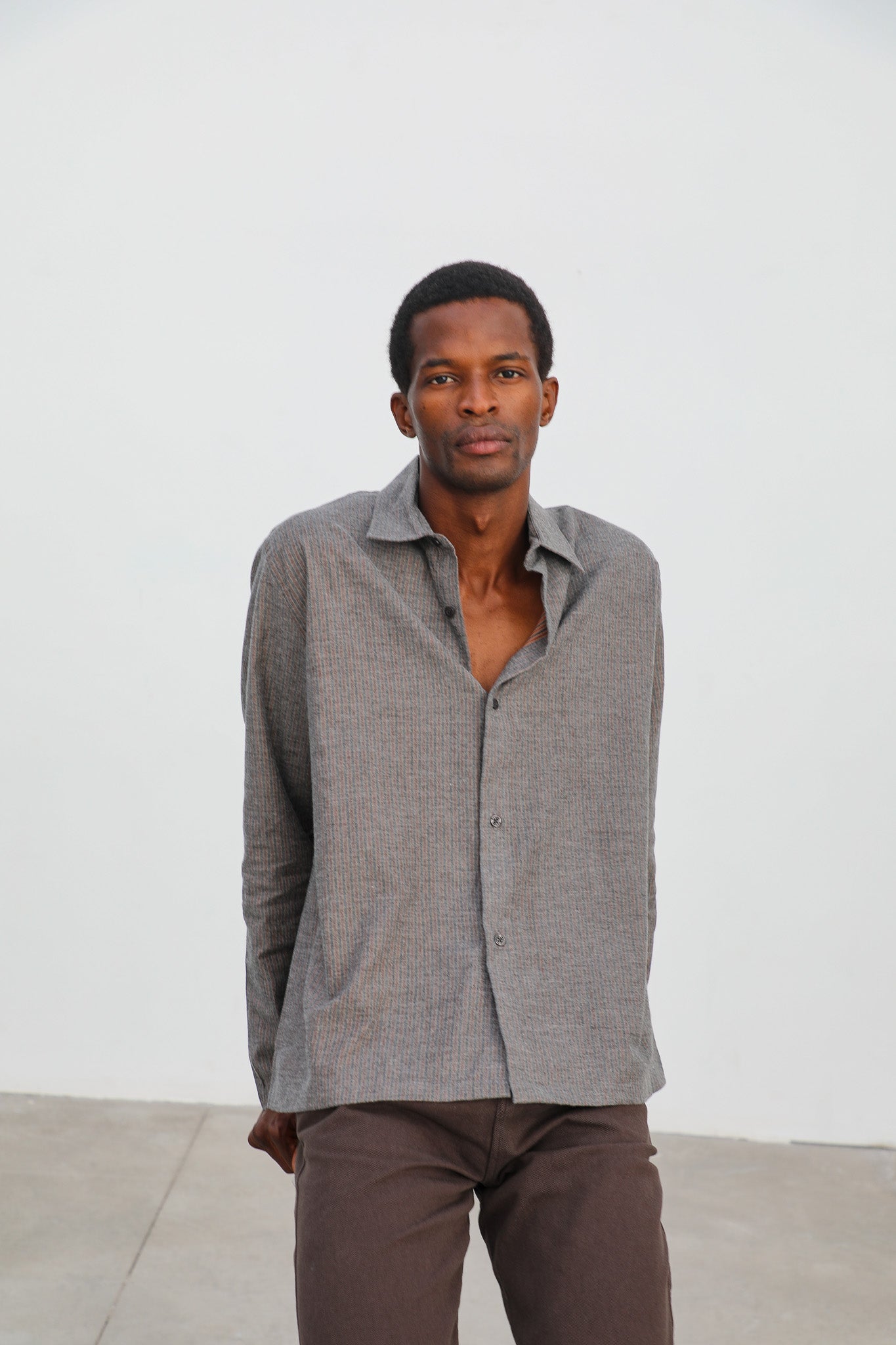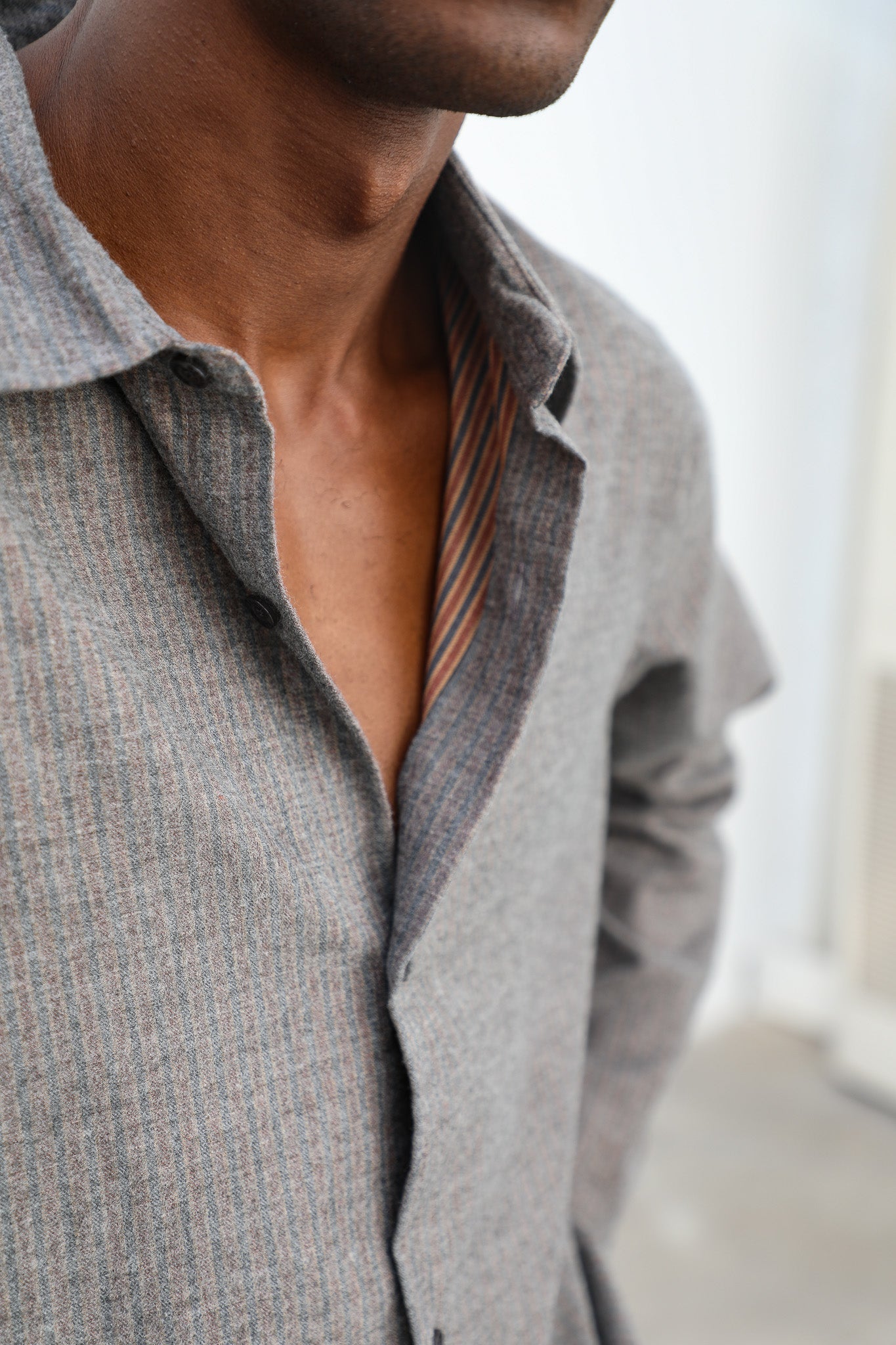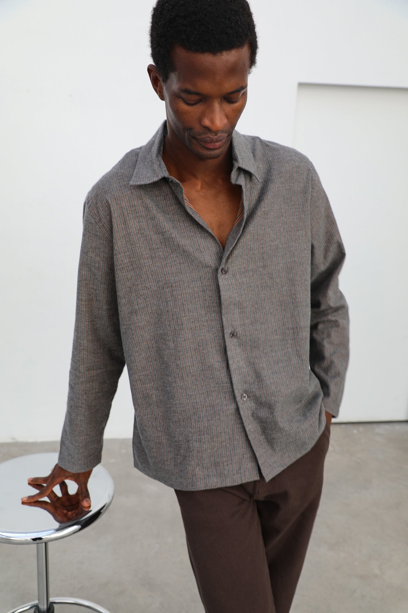 Brown and grey button-down shirt featuring a striped pattern and cropped fit.