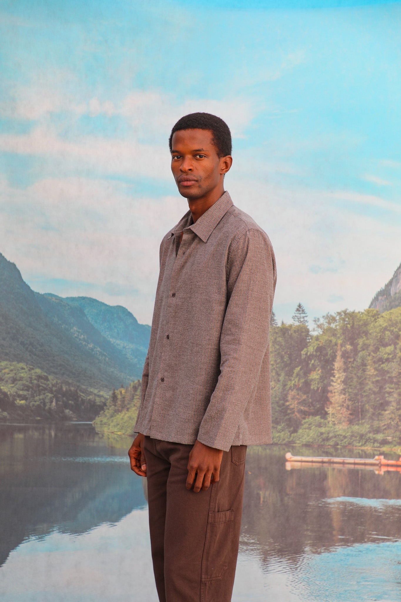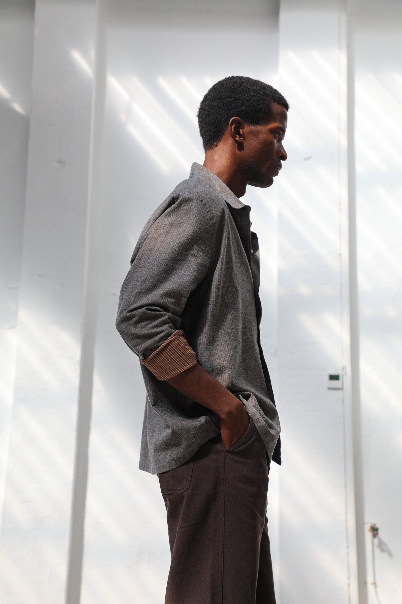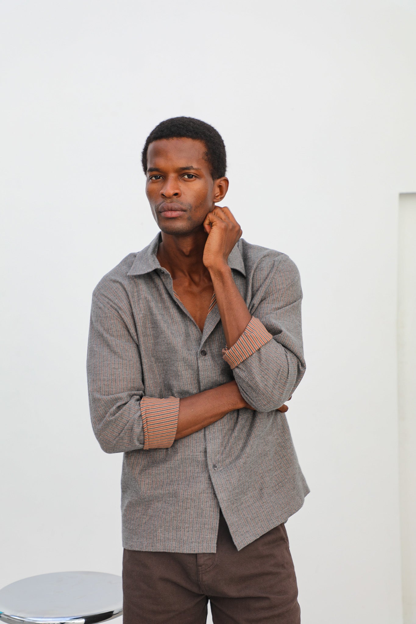 Brown and grey button-down shirt featuring a striped pattern and cropped fit.