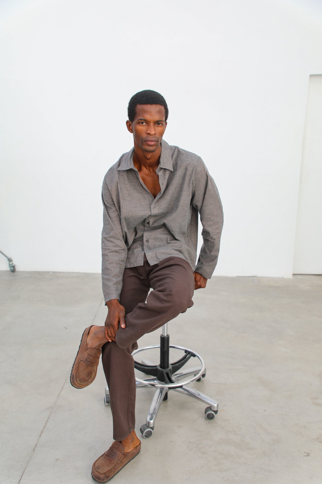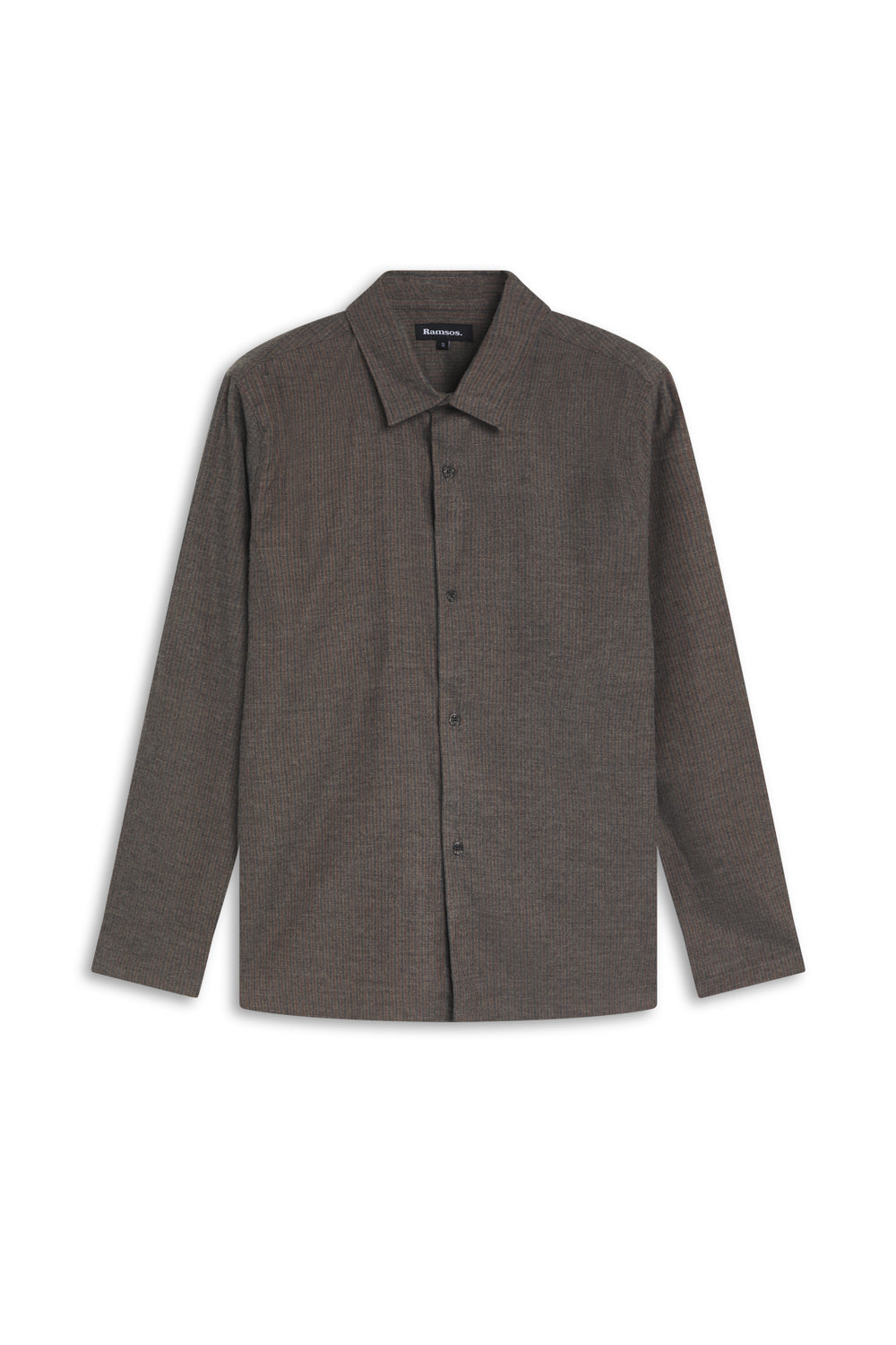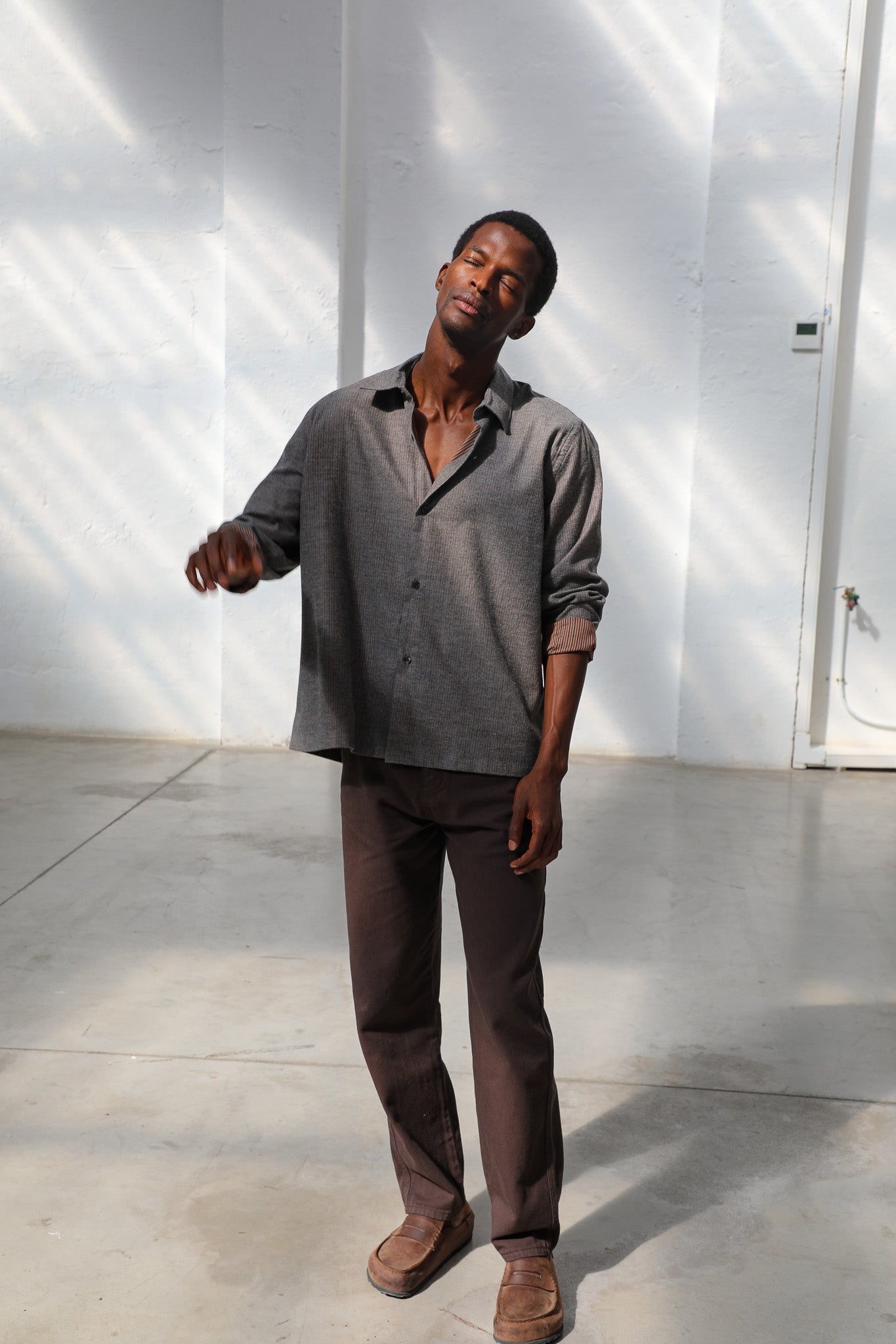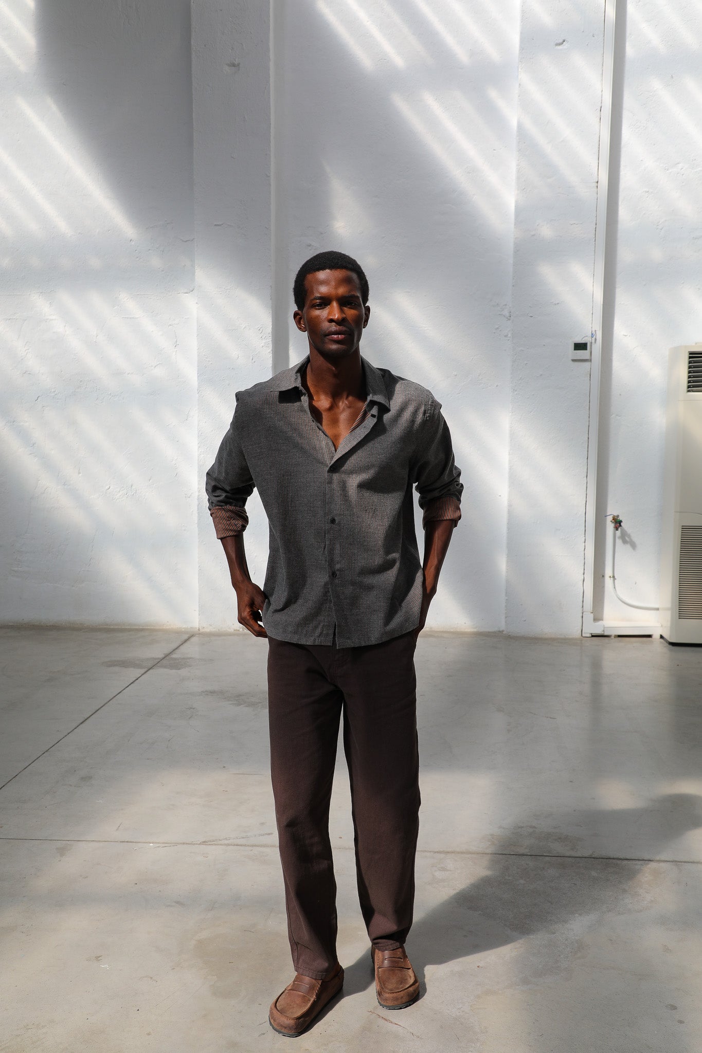 Brown and grey button-down shirt featuring a striped pattern and cropped fit.
