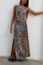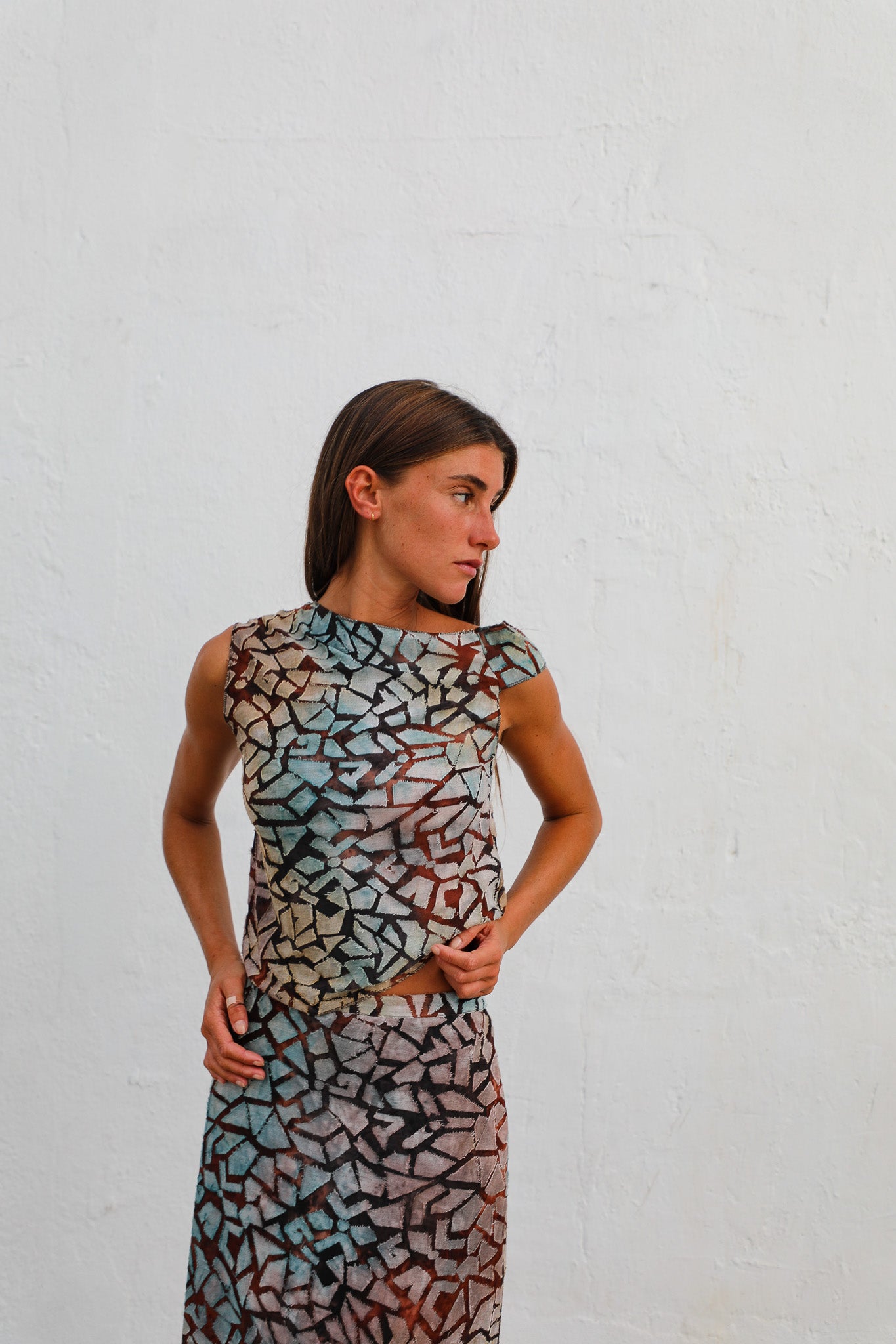 Asymmetric top crafted from a stretchy fabric, featuring a geometric multicolor pattern in sophisticated shades of blue, brown, and beige. Pair with the Twist Midi Skirt to complete the total look.