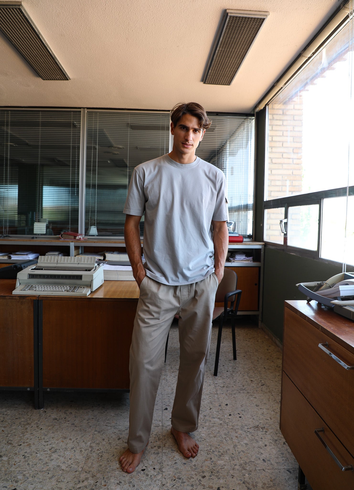 Wide-fit men's pants in beige cotton fabric, designed for a relaxed, comfortable style. Featuring an elastic waistband with internal adjustable laces, side pockets, a cargo pocket detail on the left side, and two large open pockets at the back for added convenience. These pants are generously sized, so it's recommended to order a smaller size for a less oversized fit.