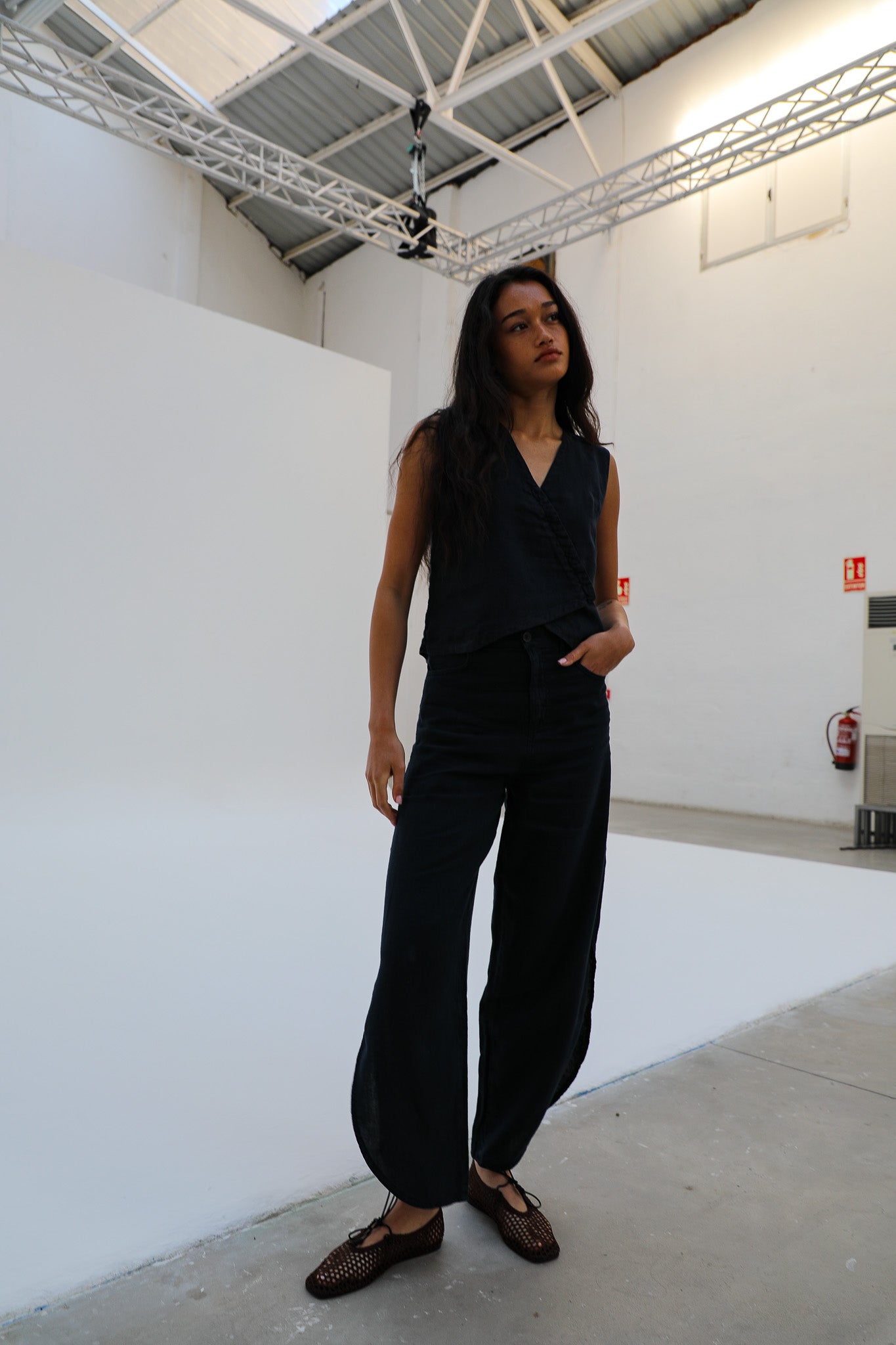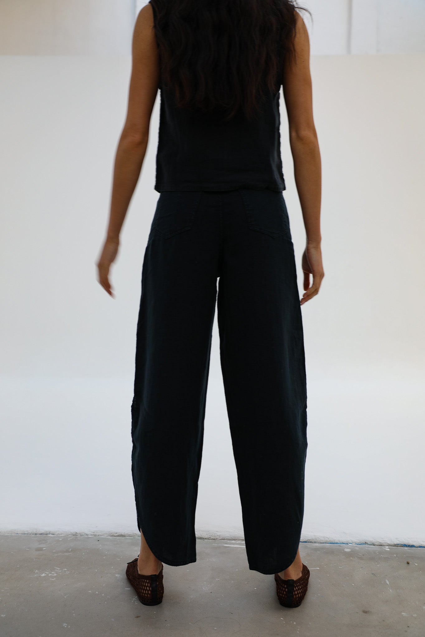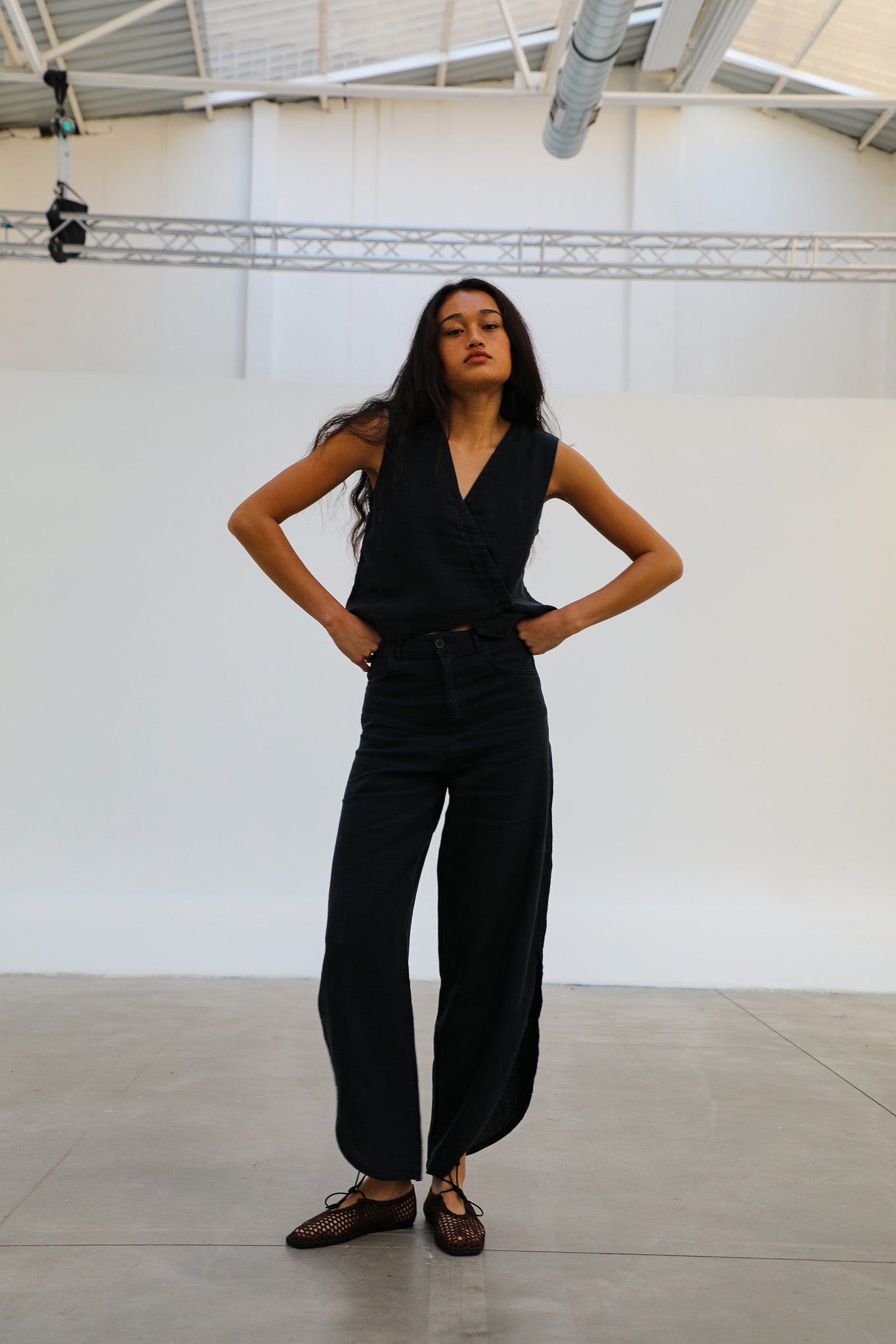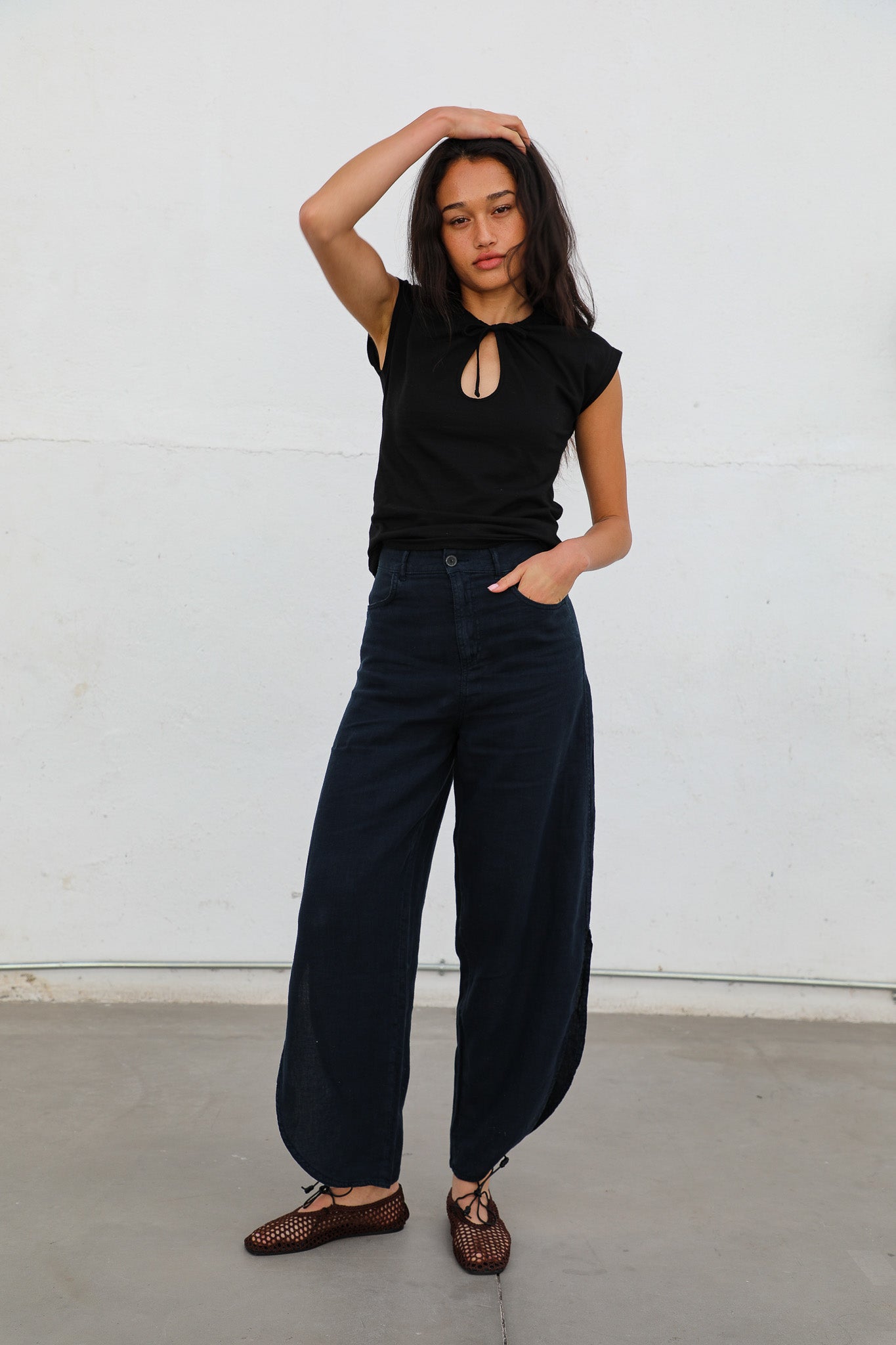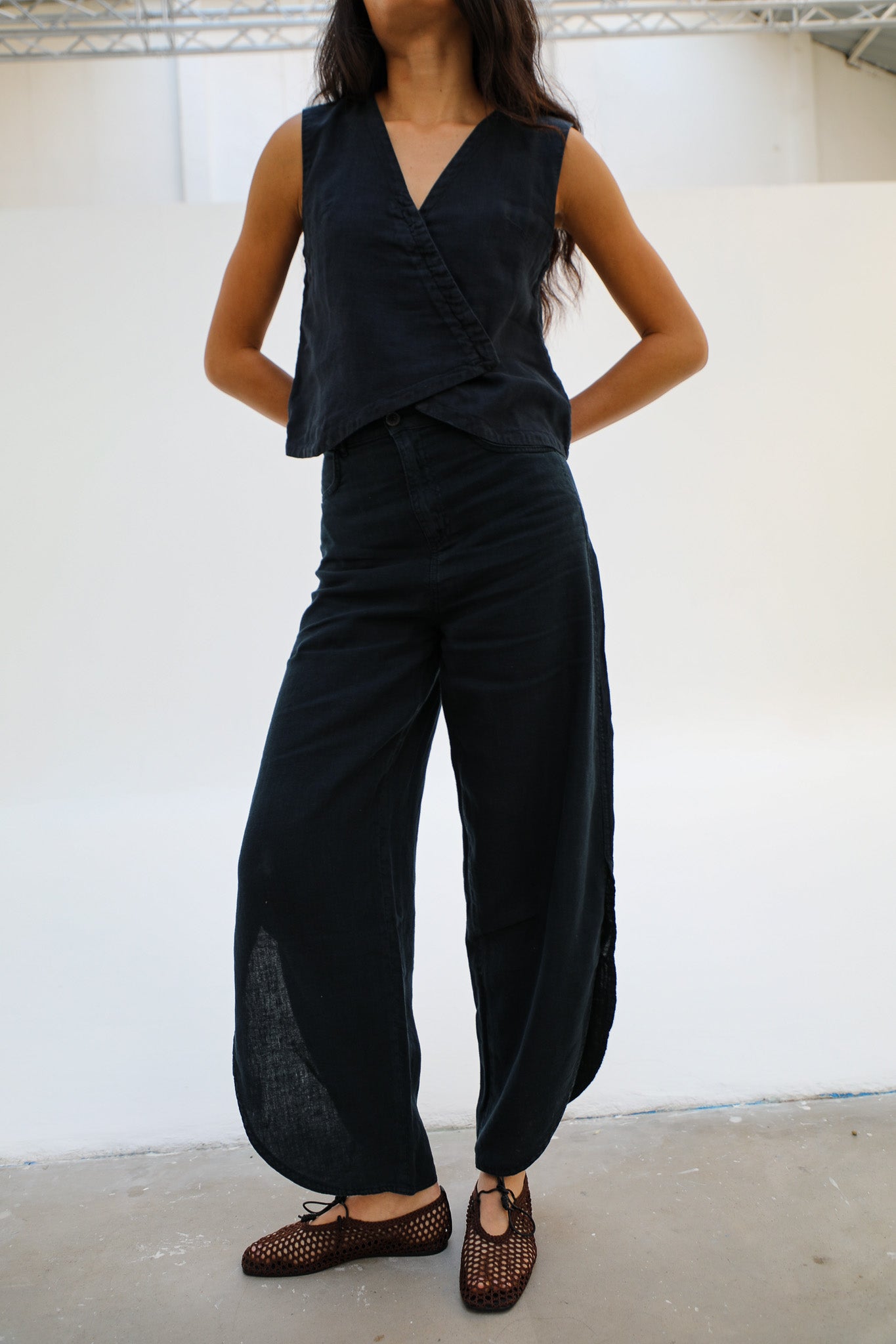 High-waisted wide-leg navy linen pants featuring a stylish side slit and a curved hem.
