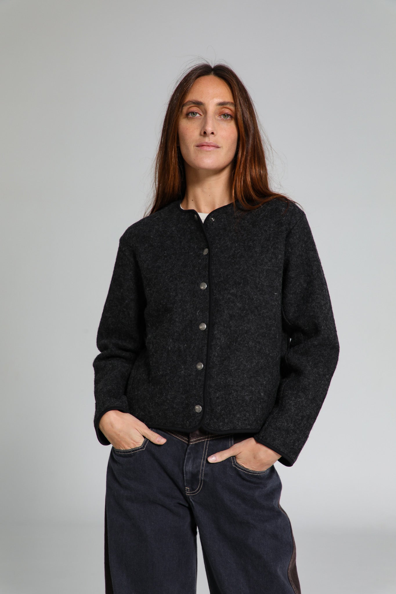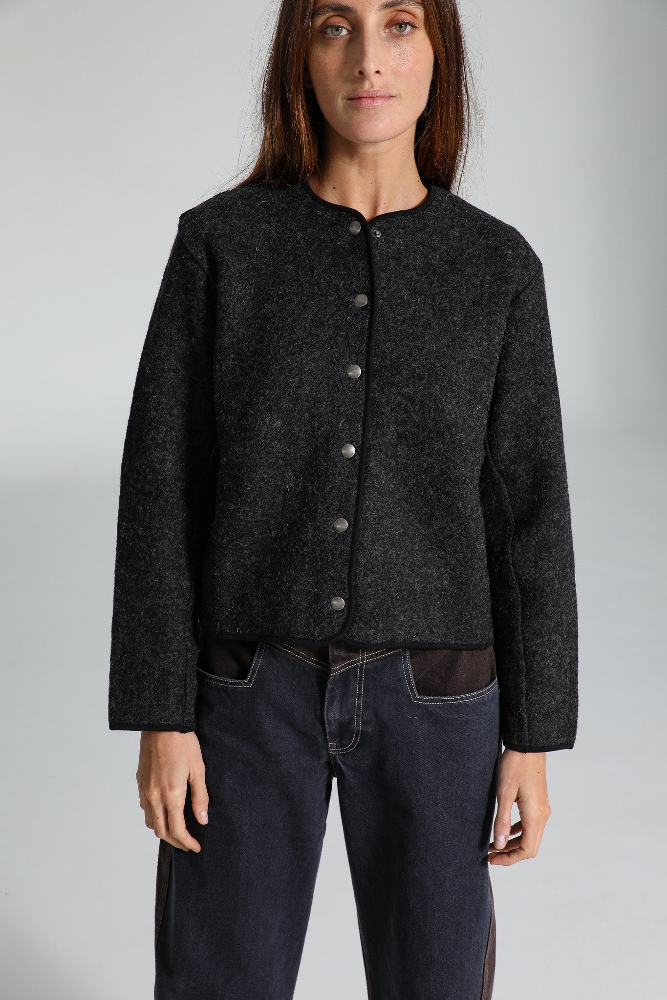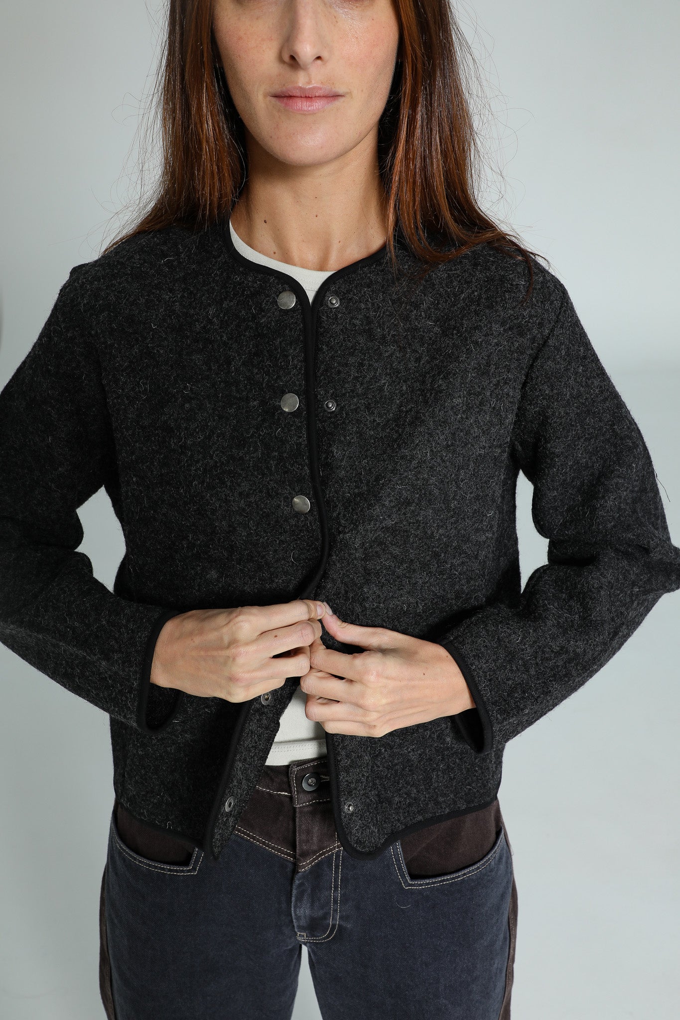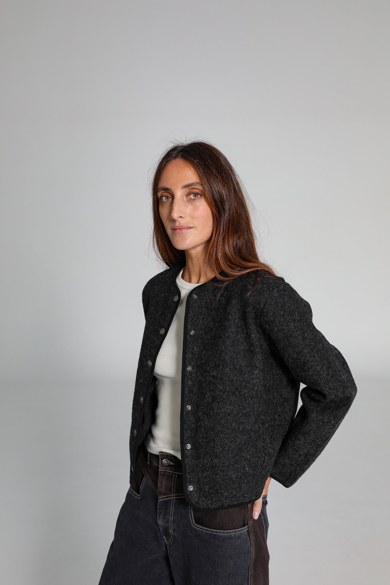 Dark grey wool coat featuring a sleek neckline, functional side pockets, and a button closure down the front.