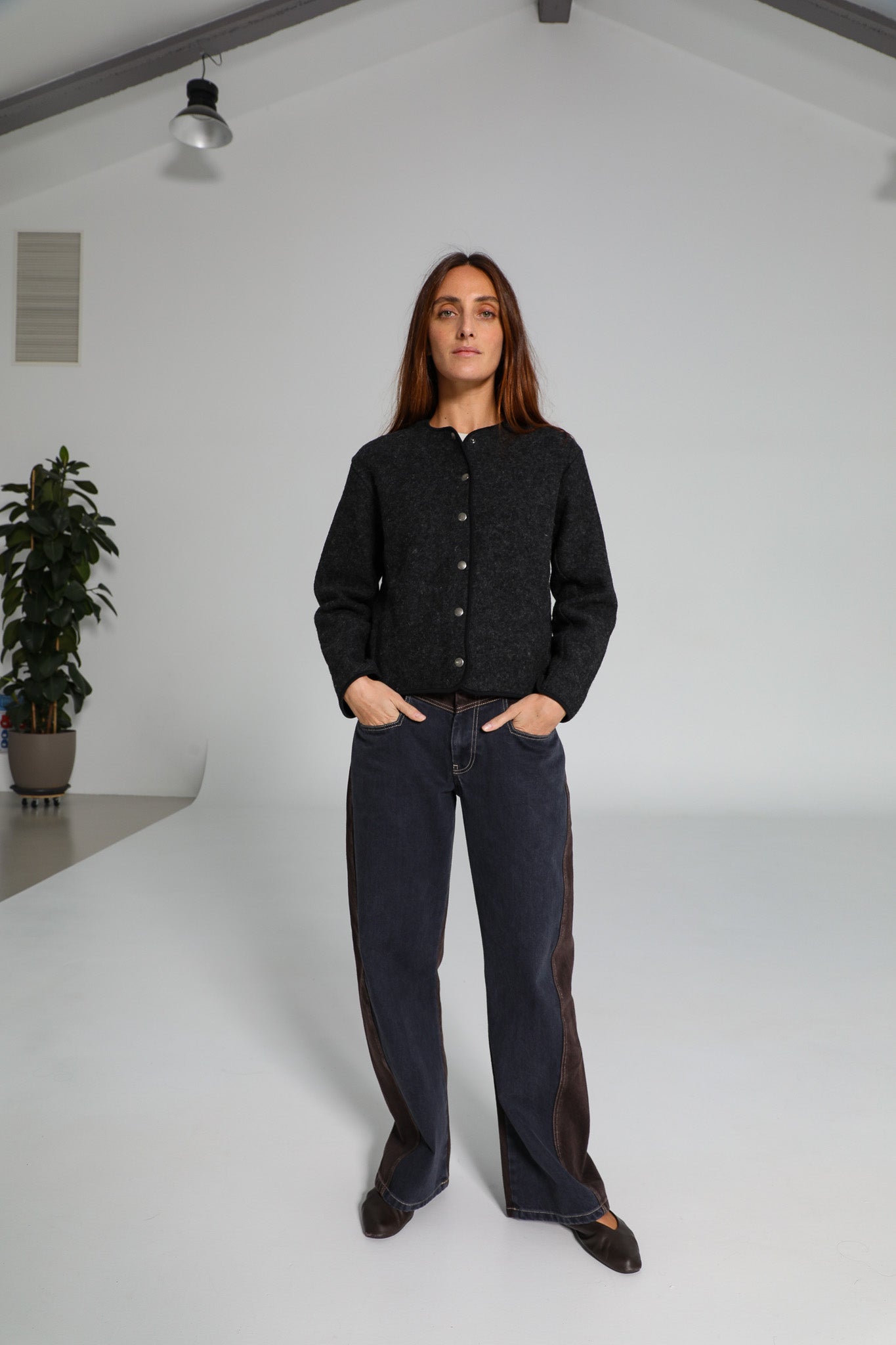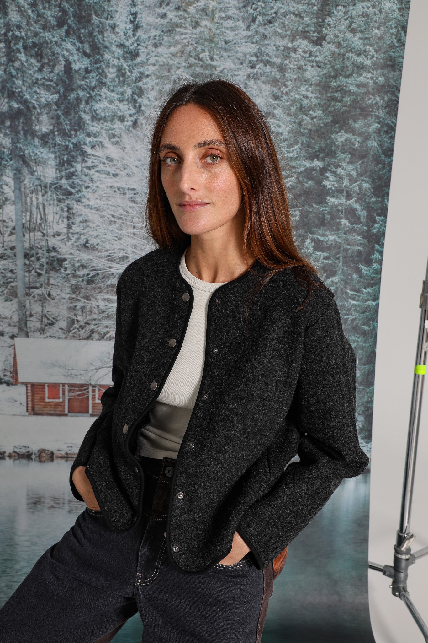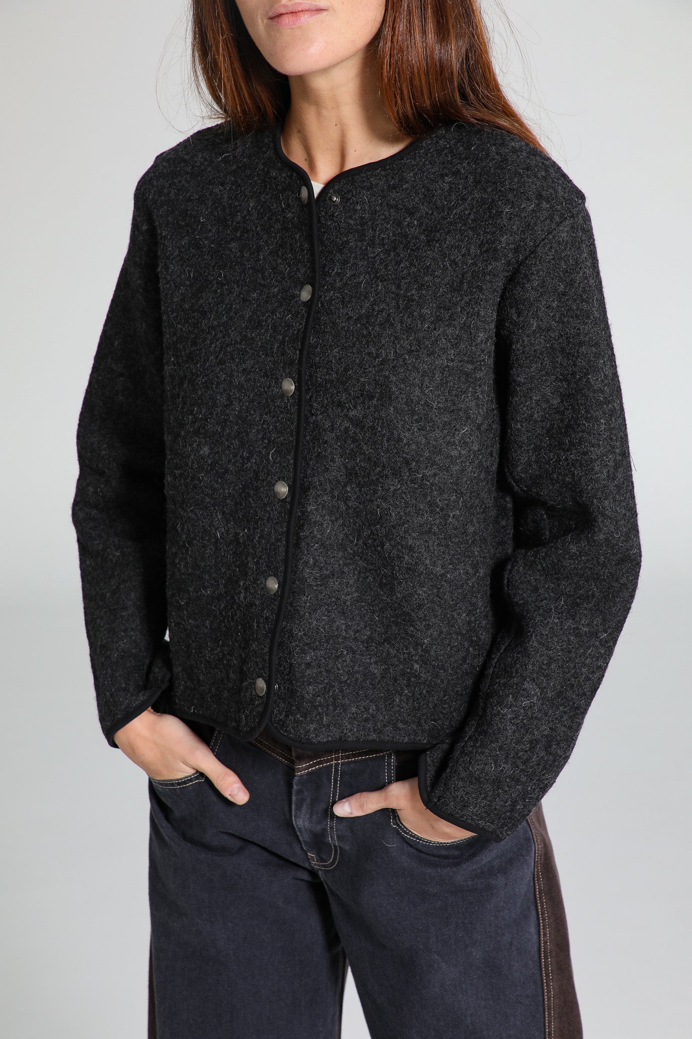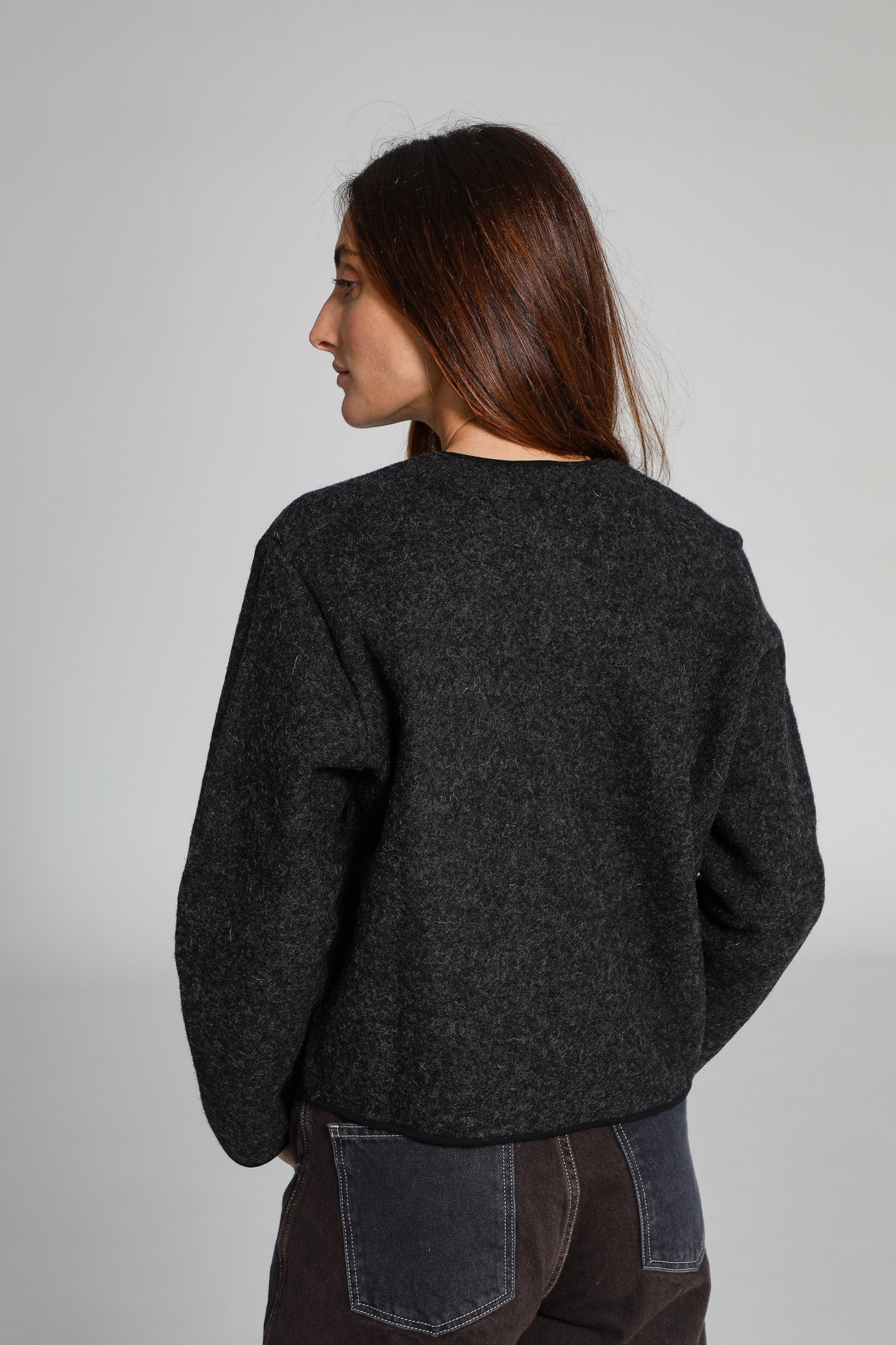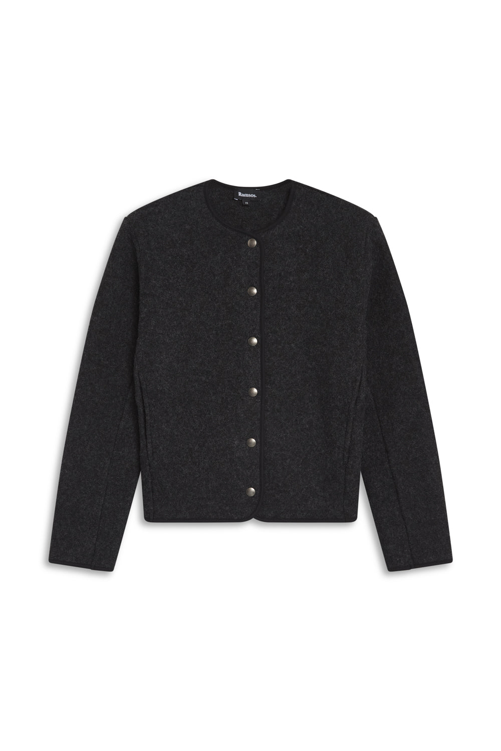 Dark grey wool coat featuring a sleek neckline, functional side pockets, and a button closure down the front.