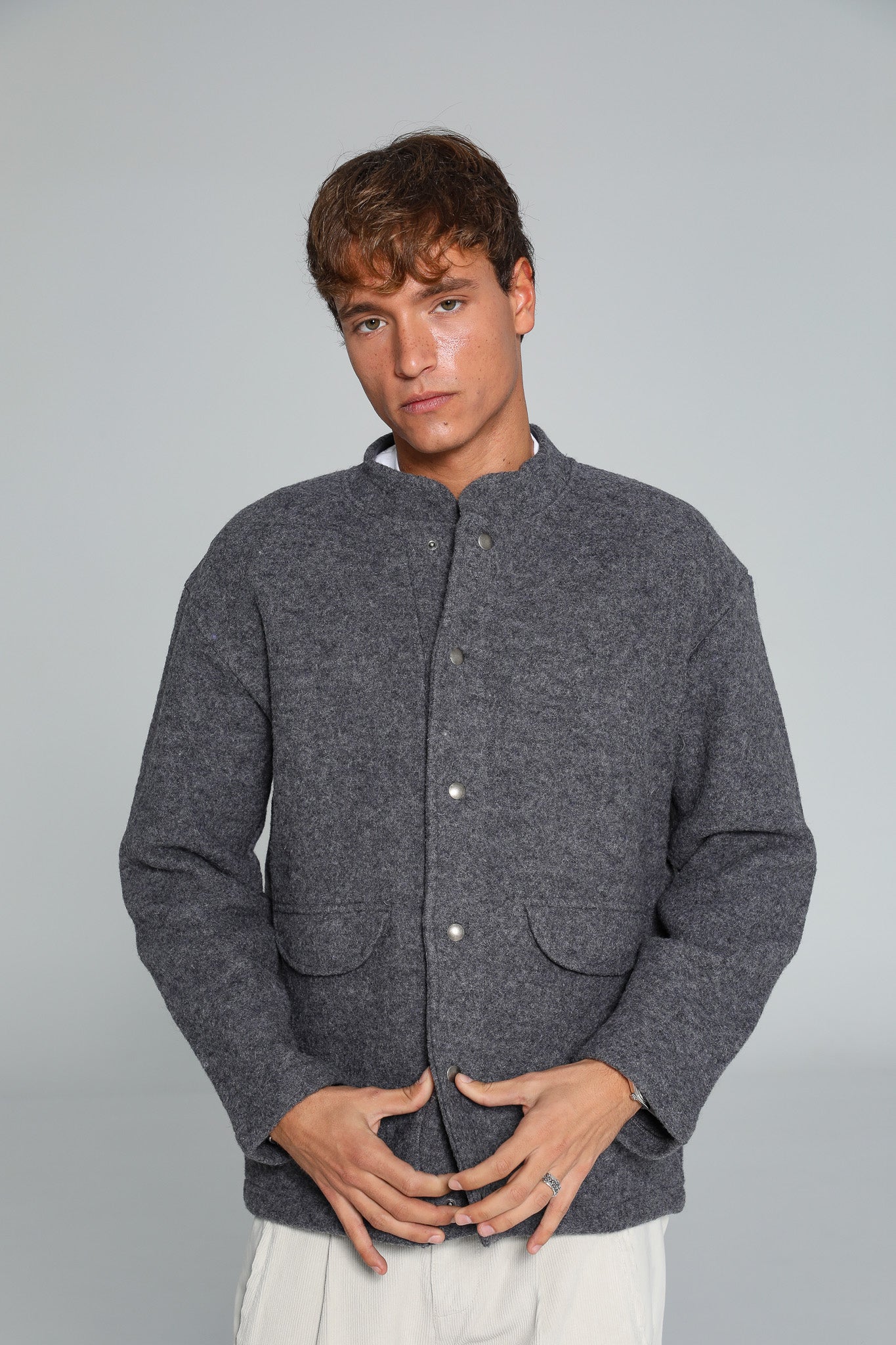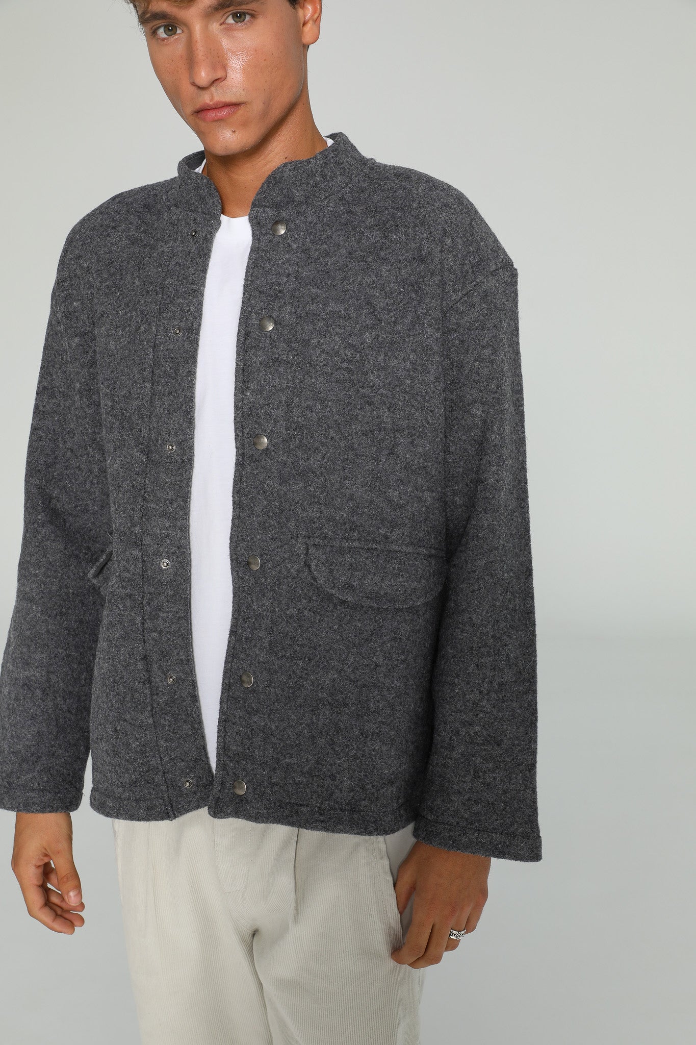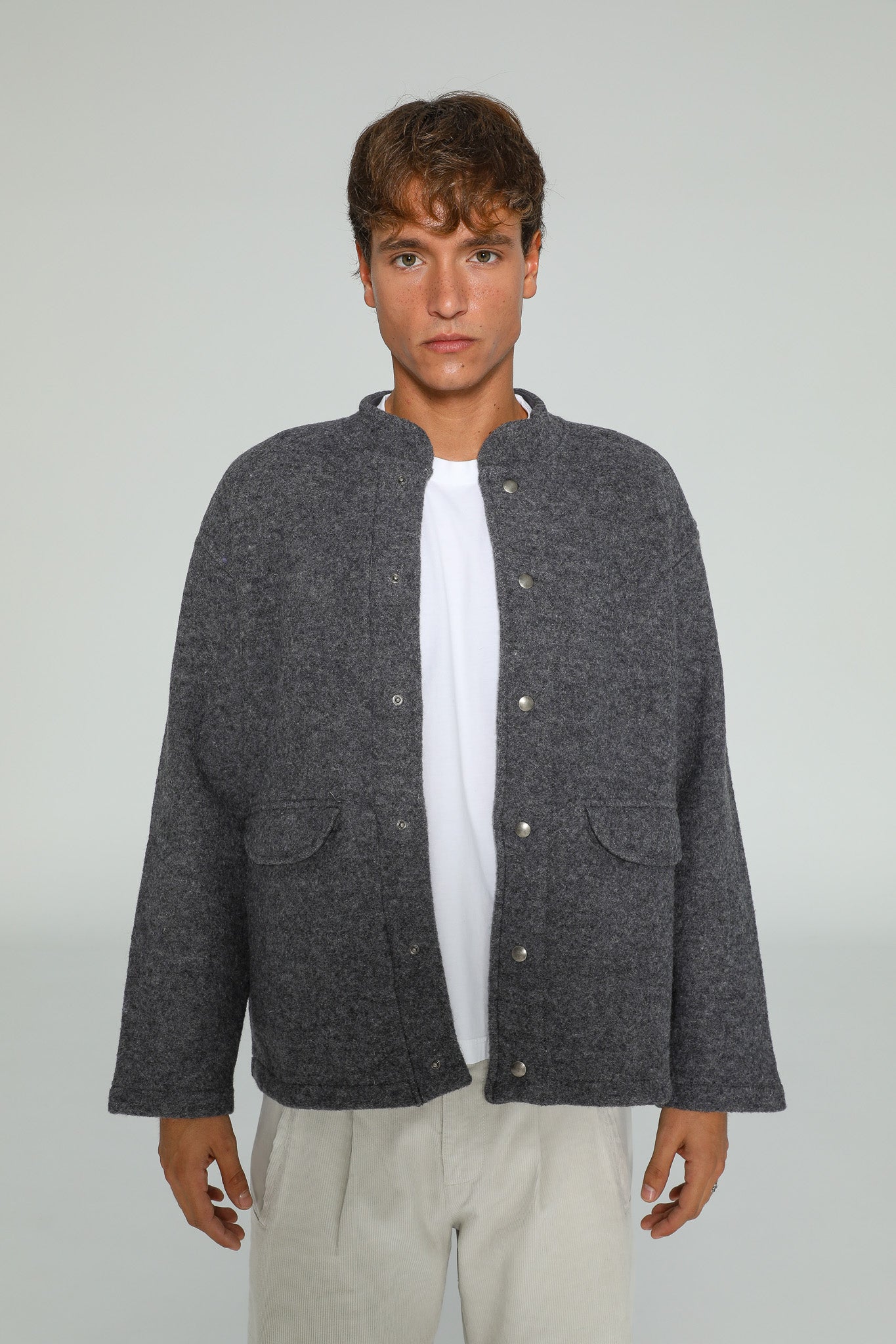 Grey wool coat featuring a sleek neckline and functional buttons, designed with an oversized fit for a relaxed, modern silhouette. You can opt for a size smaller if you prefer a more tailored look.