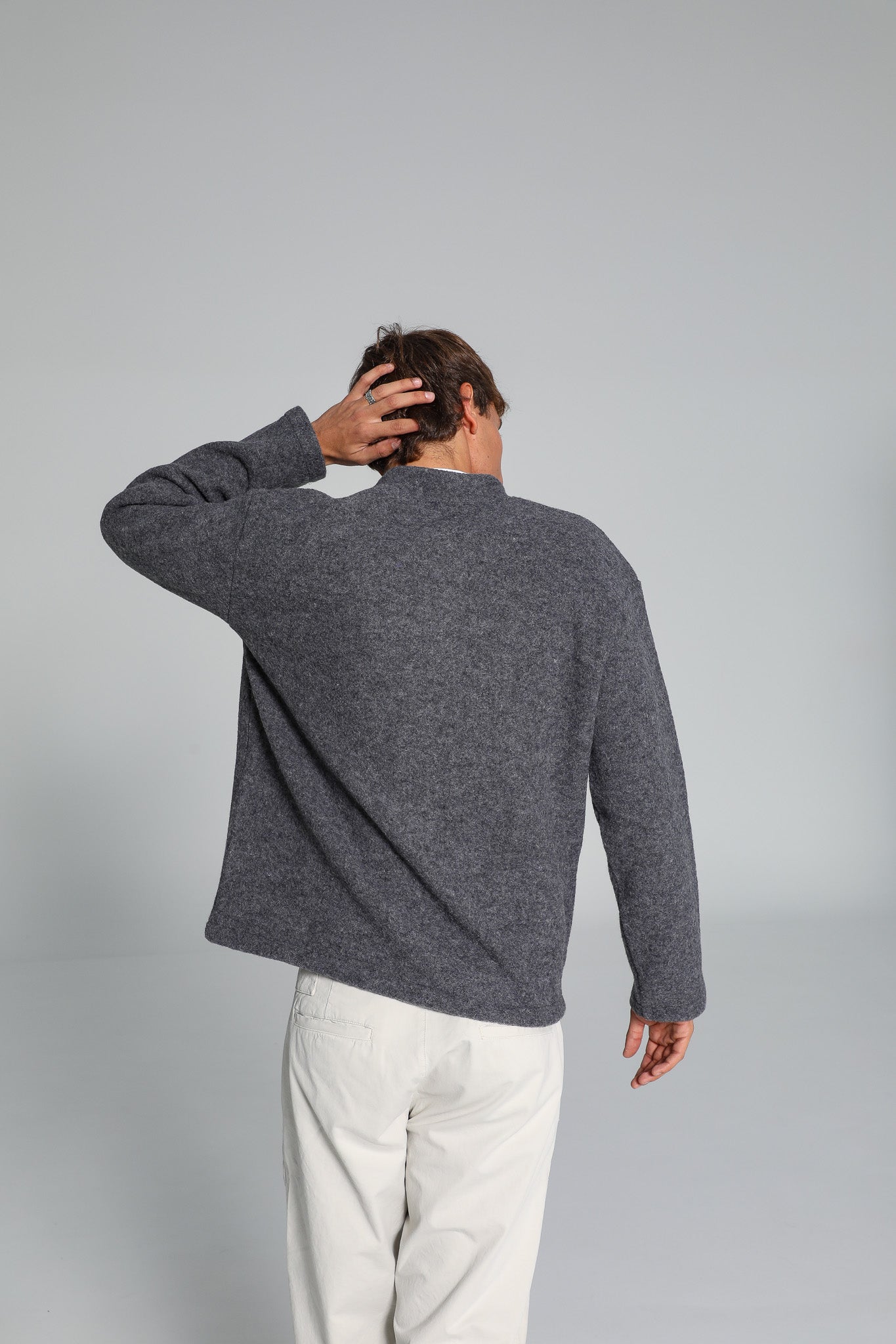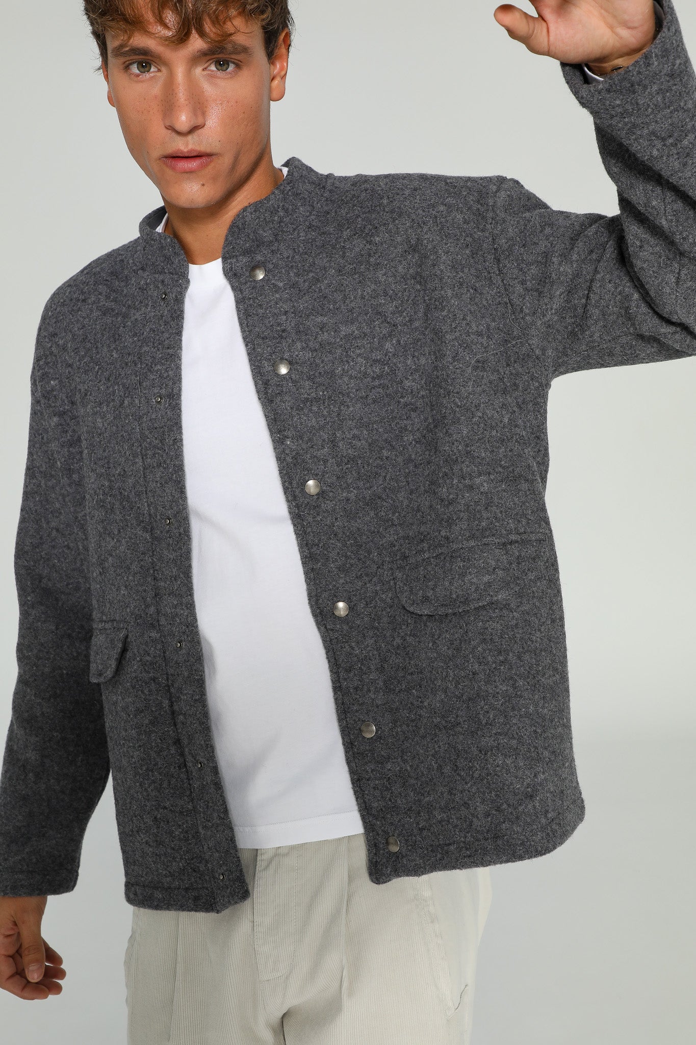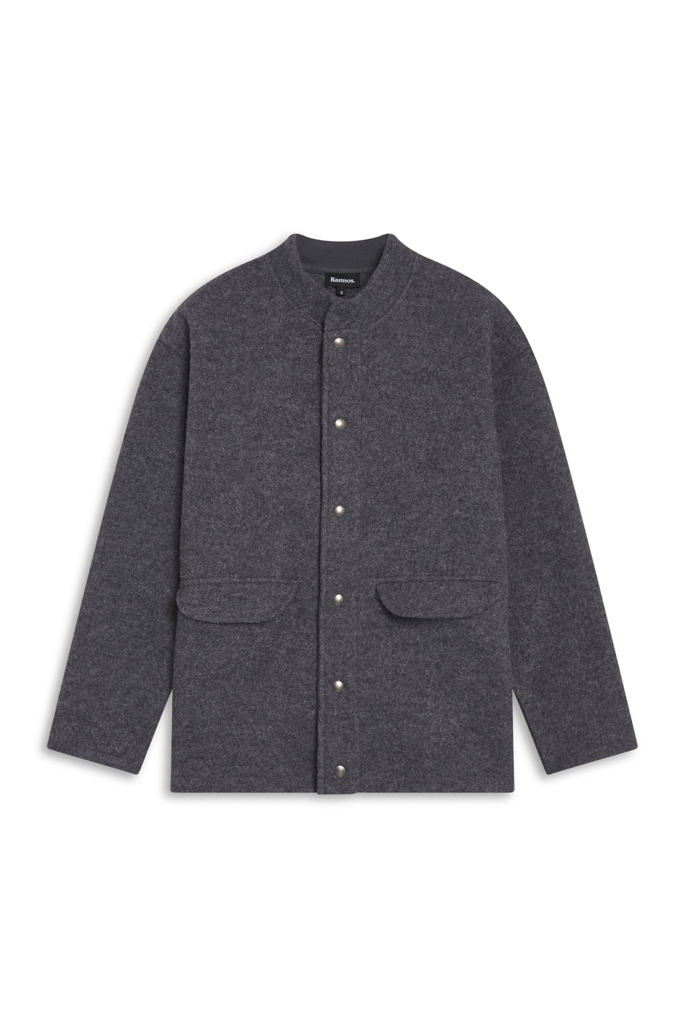 Grey wool coat featuring a sleek neckline and functional buttons, designed with an oversized fit for a relaxed, modern silhouette. You can opt for a size smaller if you prefer a more tailored look.
